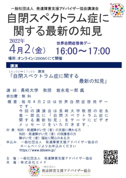 その世界自閉症啓発デーに合わせ、一般社団法人発達障害支援アドバイザー協会でも講演会の開催が決定致しました。