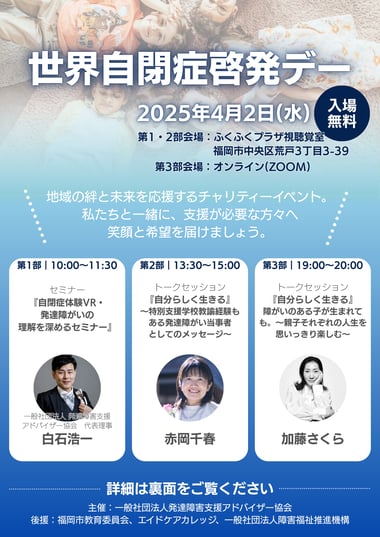 📢【4月2日は世界自閉症啓発デー】🌍💙 発達障がいの理解を深めるための特別イベントを開催!✨ VR体験を通して自閉症の感覚を知り、リアルな視点から支援方法を学べる貴重な機会です。 📅 日時:2025年4月2日(水) 📍 会場:ふくふくプラザ(福岡)+ オンライン配信 🎥 💰 参加費:無料 🔹 第1部(10:00~11:30) 🕶 自閉症体験VR &...