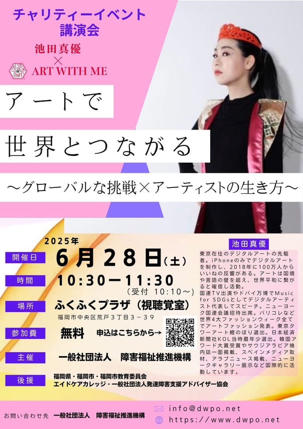 🎨チャリティー講演会のお知らせ🌍 「アートで世界とつながる」 ~グローバルな挑戦 × アーティストの生き方~ 多様性をアートで伝え、世界とつながる🌈 アーティスト・池田真優氏が、自身の経験を通じて語る“生き方”と“挑戦”。 🗓令和7年6月28日(土) 🕥10:30〜11:30 📍福岡市市民福祉プラザ 視聴覚室 🎟入場無料(チャリティーイベント)...
